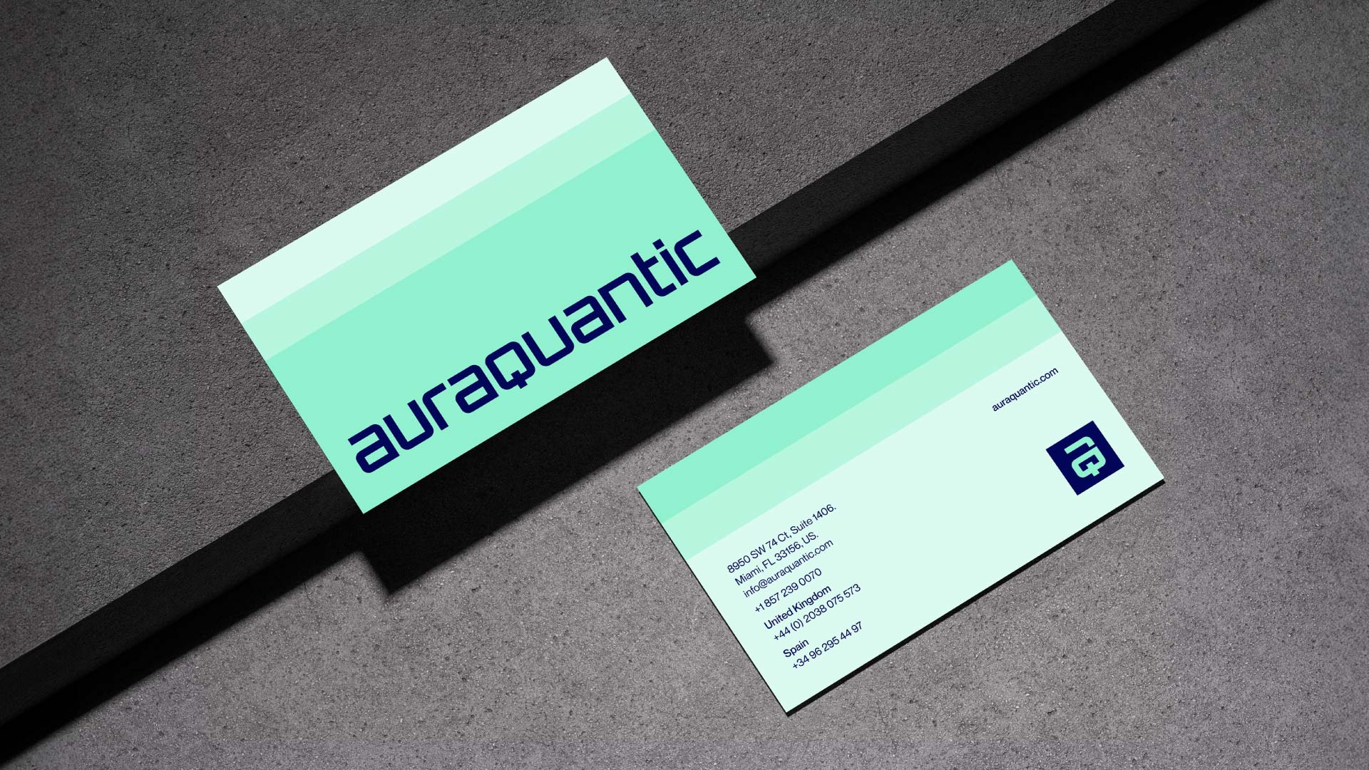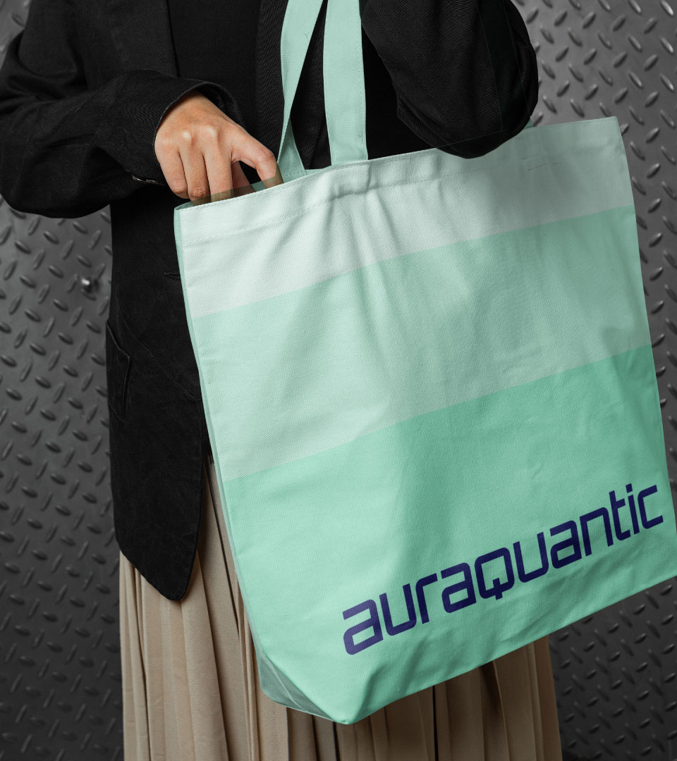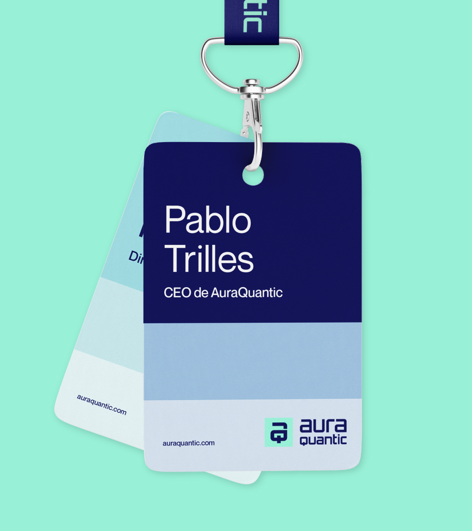 Se construye a partir de un sutil degradado y una retícula de bloques que aporta profundidad, dinamismo y versatilidad. Este lenguaje gráfico flexible refuerza la identidad de AuraQuantic y transmite movimiento y evolución constante, adaptándose con coherencia a todos los soportes de comunicación de la marca.
